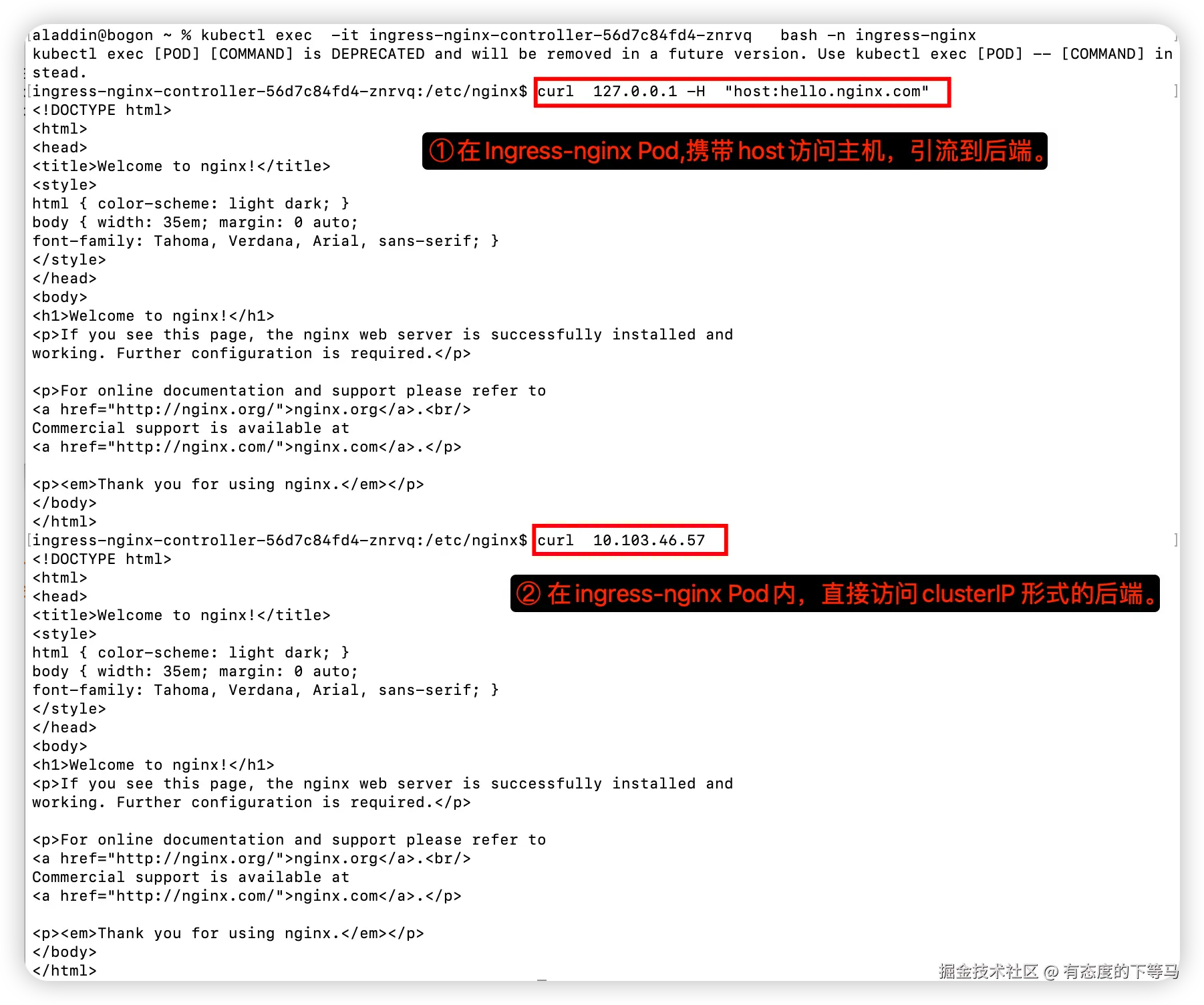 启动minikube tunnel, 然后在新的终端执行curl 127.0.0.1 -H "host:hello.nginx.com" 你会看到nginx服务的Welcome to nginx!输出。