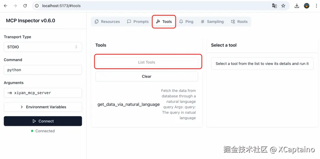 - 切换到tools页面,点击list tools会跳出来文本到sql的工具