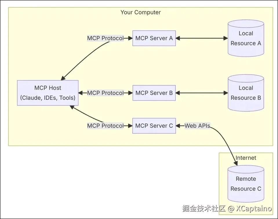 这张图展示了MCP的核心架构:host,client和server是独立的。host可以是客户端或者APP,client建立起跟server的连接,而server实现对data、resource的封装,可以看成工具调用。
