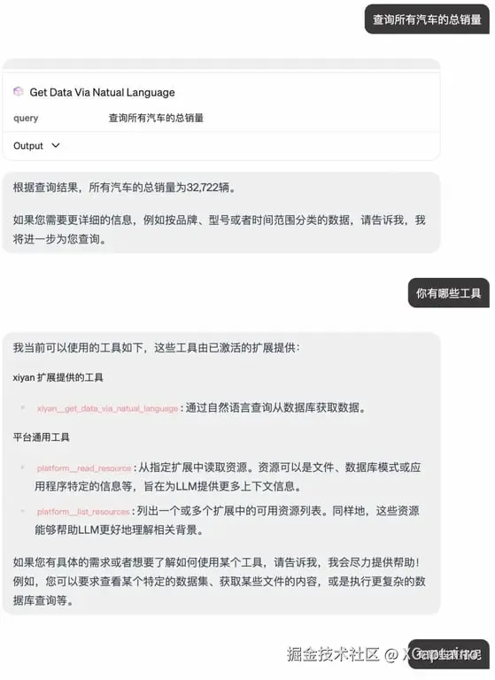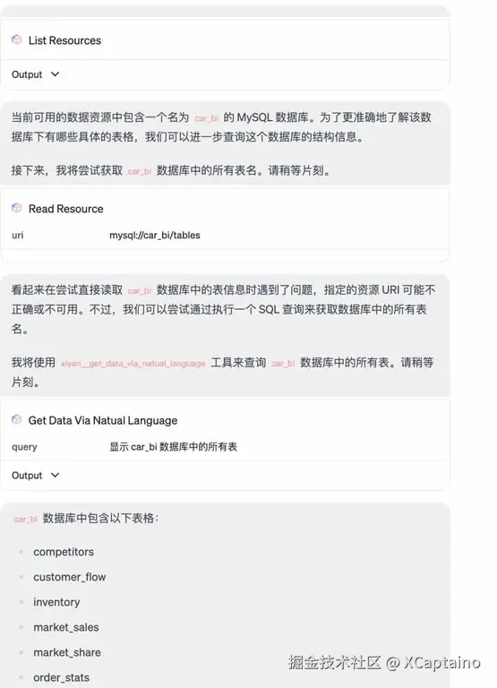 为了更好的工具调用效果,选择支持自然语言接口的析言MCP服务(Xiyan-mcp-server[4]),可以用自然语言访问数据库,并从数据库获得答案,是当前Test-to-SQL公开基准上的SOTA。