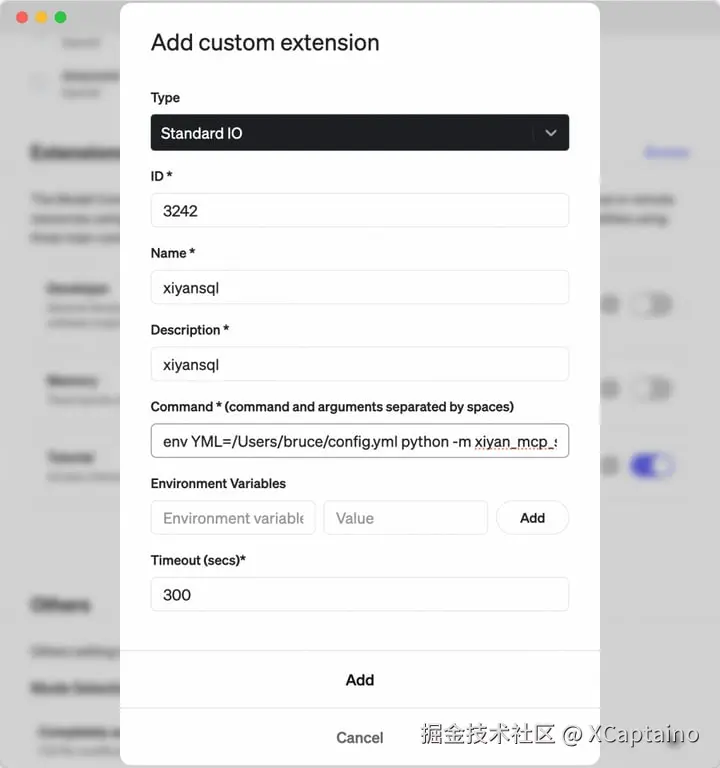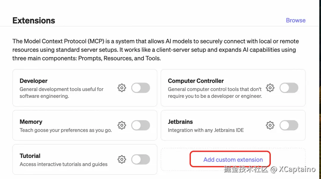 为了更方便交互,我们找一个客户端来调用后台的数据服务。目前有非常多支持MCP的客户端,比如开源的MCP的client[7]、闭源的claude desktop等等。这里我们选用的是goose,这是一个开源的支持MCP的client,原生支持MacOS。