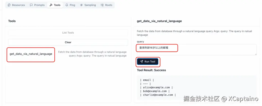 输入问题“查询年龄16岁以上的邮箱”,点击“run tool”