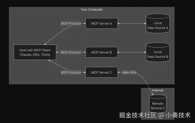 - Remote Services: 远程服务:通过互联网提供的外部系统(例如,通过API),MCP服务器可以连接到