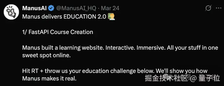 除了新的市场消息外,Manus 产品本身也推出了一些新功能和新示例 EDUCATION 2.0。