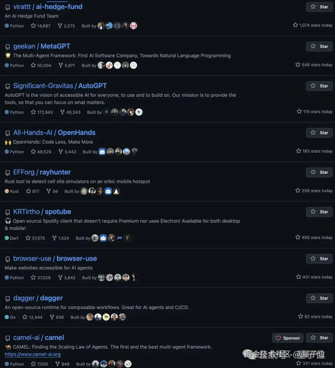 当时 GitHub 热榜上,大多是 Agent 相关的项目和工具库,老牌 Agent 项目 MetaGPT 与 AutoGPT 双双被顶到前排。
