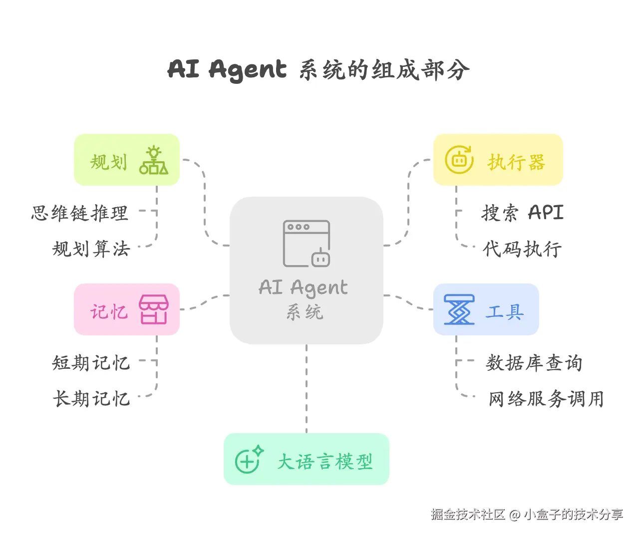 那么,一个典型的 AI Agent 系统由哪些部分组成呢?首先核心依然是大语言模型本身,它是 Agent 的大脑,负责理解任务、分析问题并决定行动策略。除此之外,通常还需要几个关键模块来配合 :