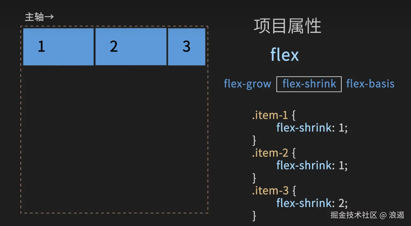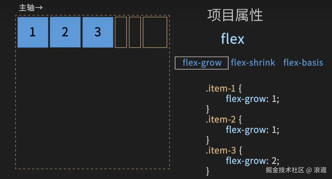 flex-grow为0,则不会分配剩余空间。 - 如果某个项目的值为1,它会占据剩余空间的一部分;如果值为2,它会占据其他项目的两倍空间。