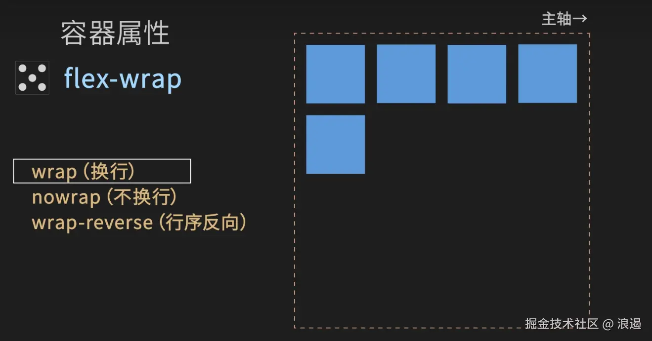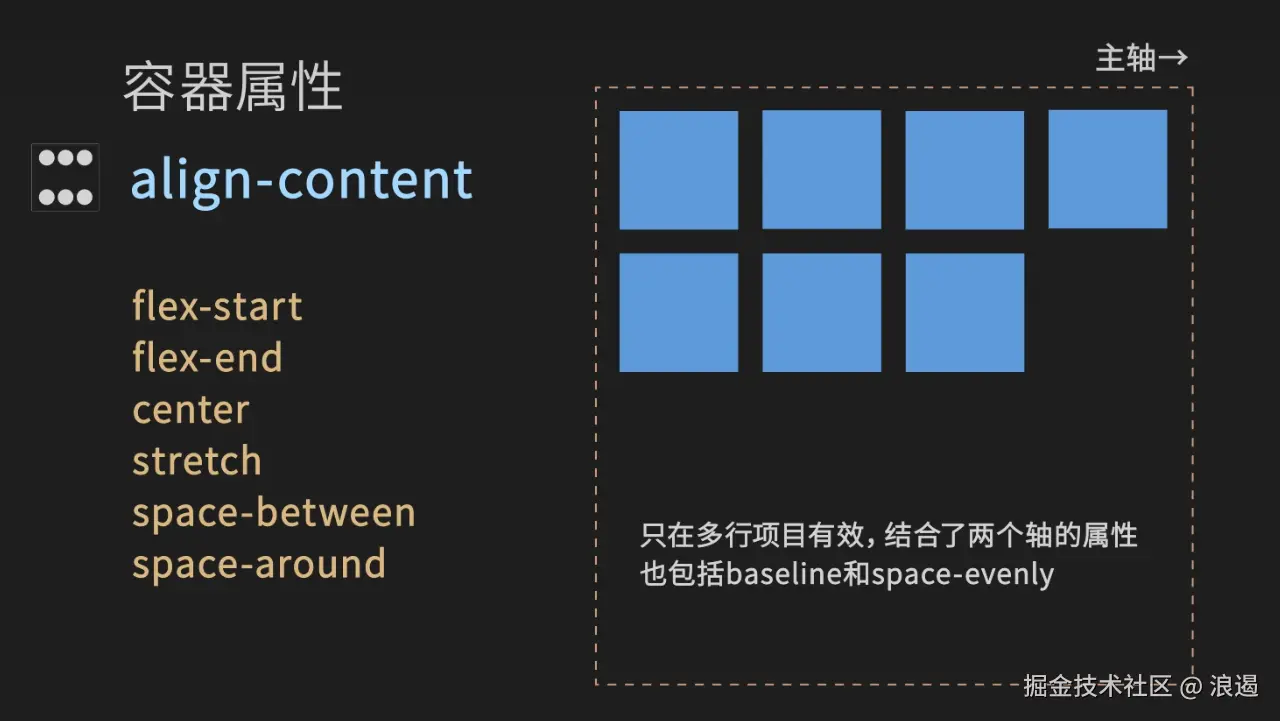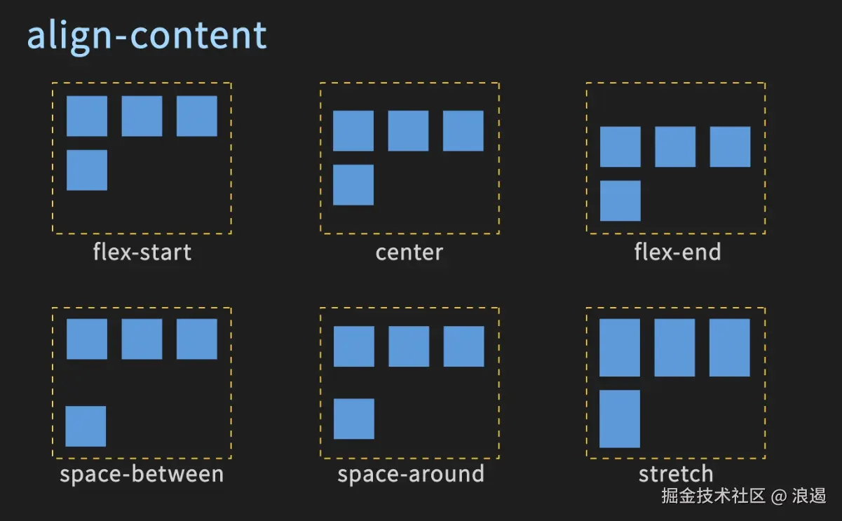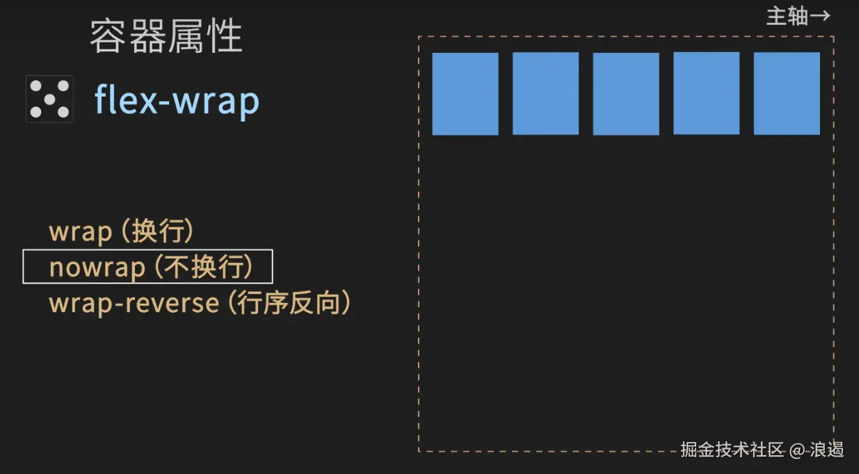 nowrap(不换行)、wrap(换行)和wrap-reverse(反向换行)。 - align-content:当多行排列时,定义多行的对齐方式。