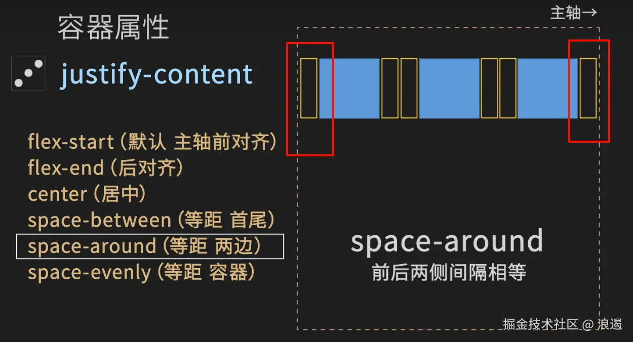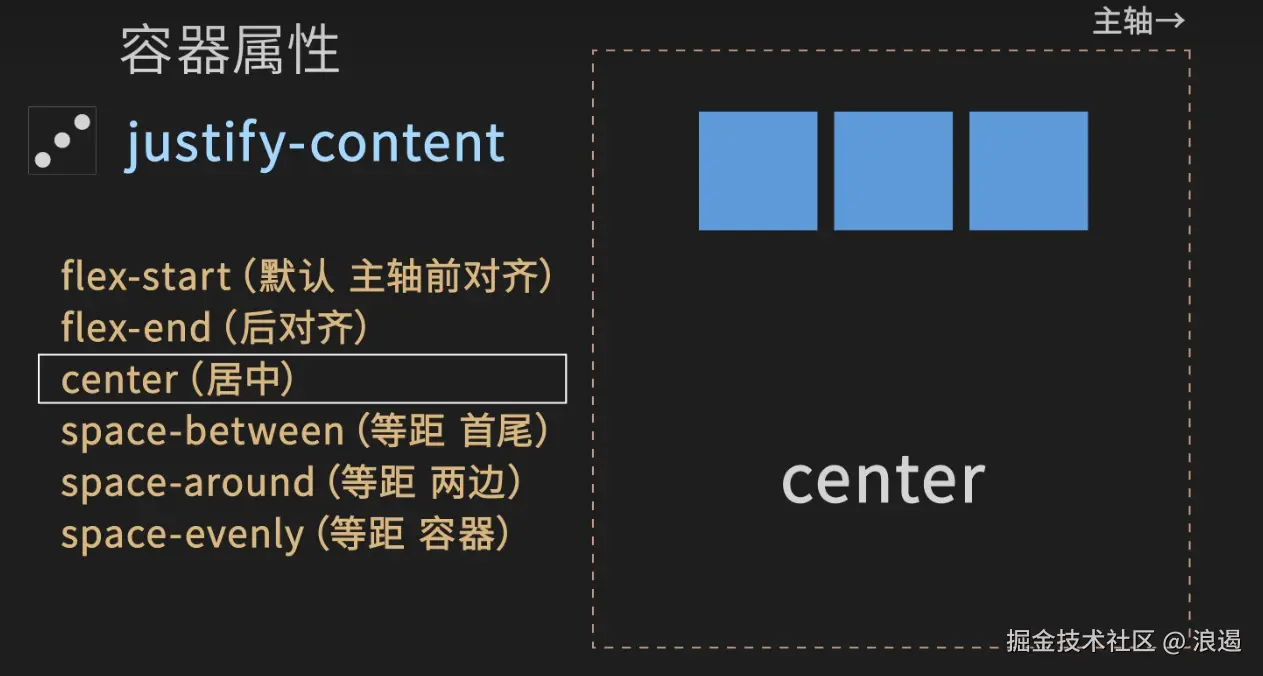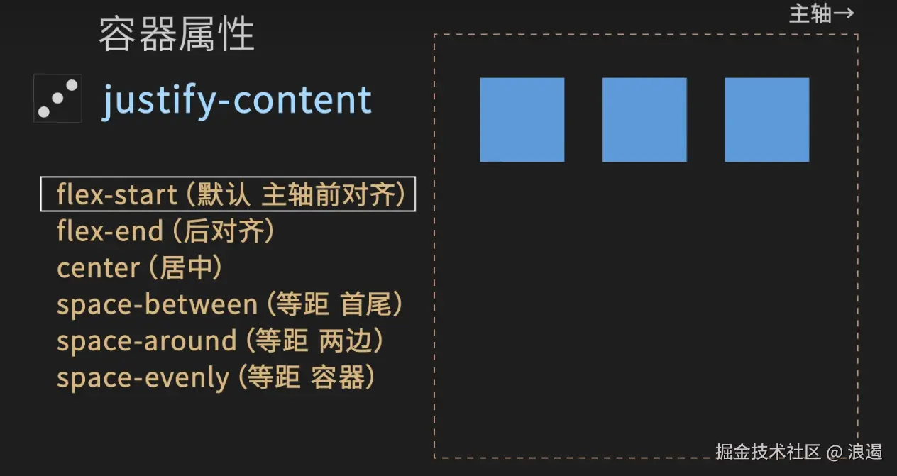 row、row-reverse、column和column-reverse。 - justify-content:定义主轴上的对齐方式,例如