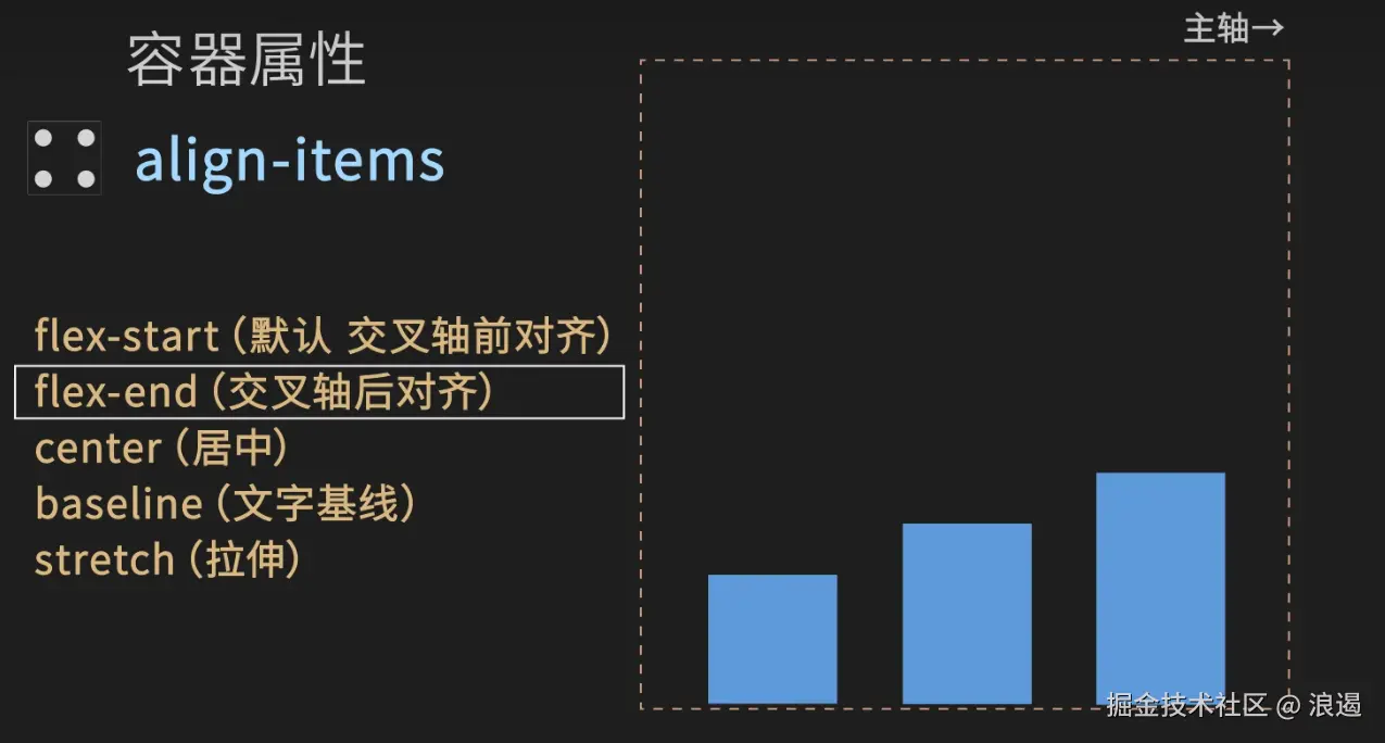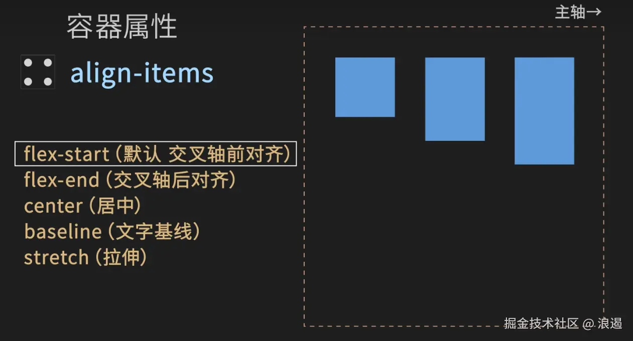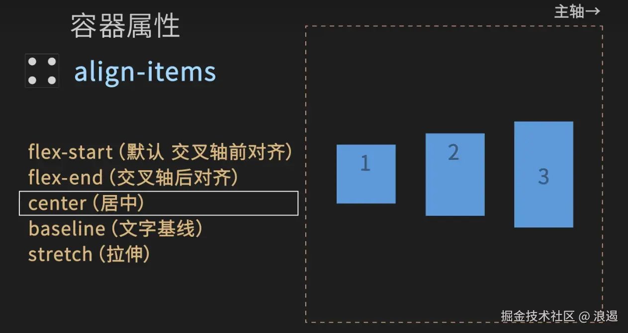 flex-start、flex-end、center等。 - align-items:定义交叉轴上的对齐方式,例如