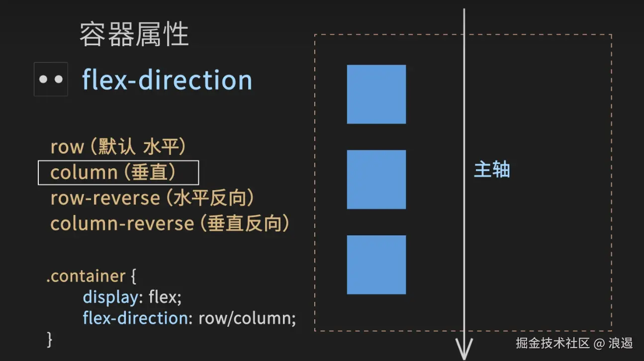 row,表示主轴为水平方向。可以通过设置为column将主轴改为垂直方向。 - 当主轴方向为