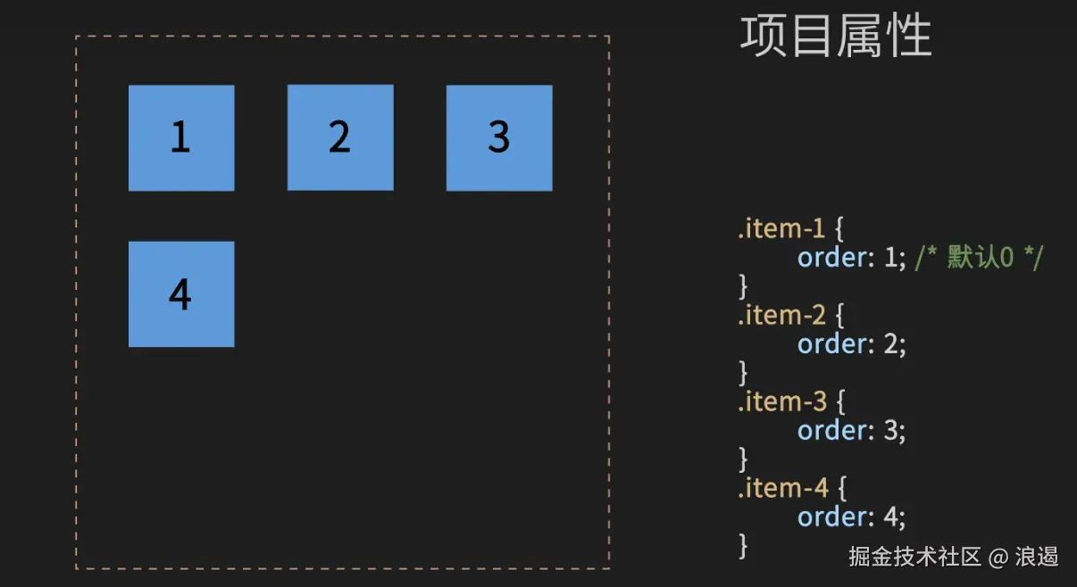 作用:控制Flex项目在容器中的排列顺序,根据项目数值定义元素的排序