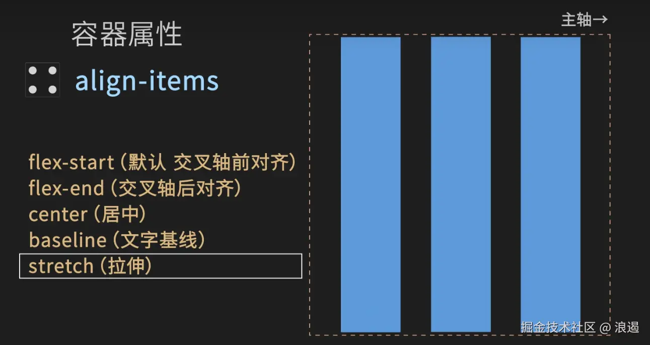flex-start:子元素靠交叉轴起点对齐。flex-end:子元素靠交叉轴终点对齐。center:子元素居中对齐。baseline:子元素的基线对齐。stretch:子元素拉伸以填充整个容器的高度。