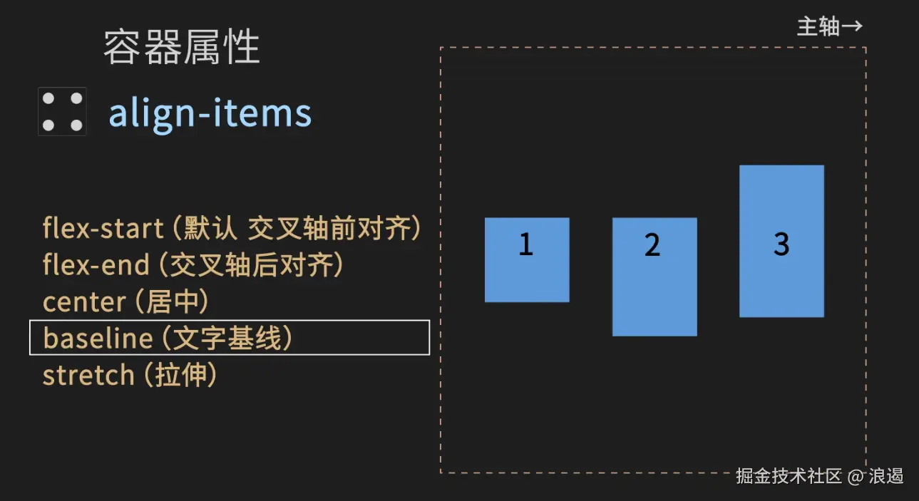 flex-start、flex-end、center等。 - align-items:定义交叉轴上的对齐方式,例如