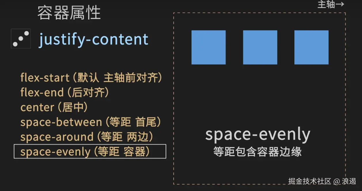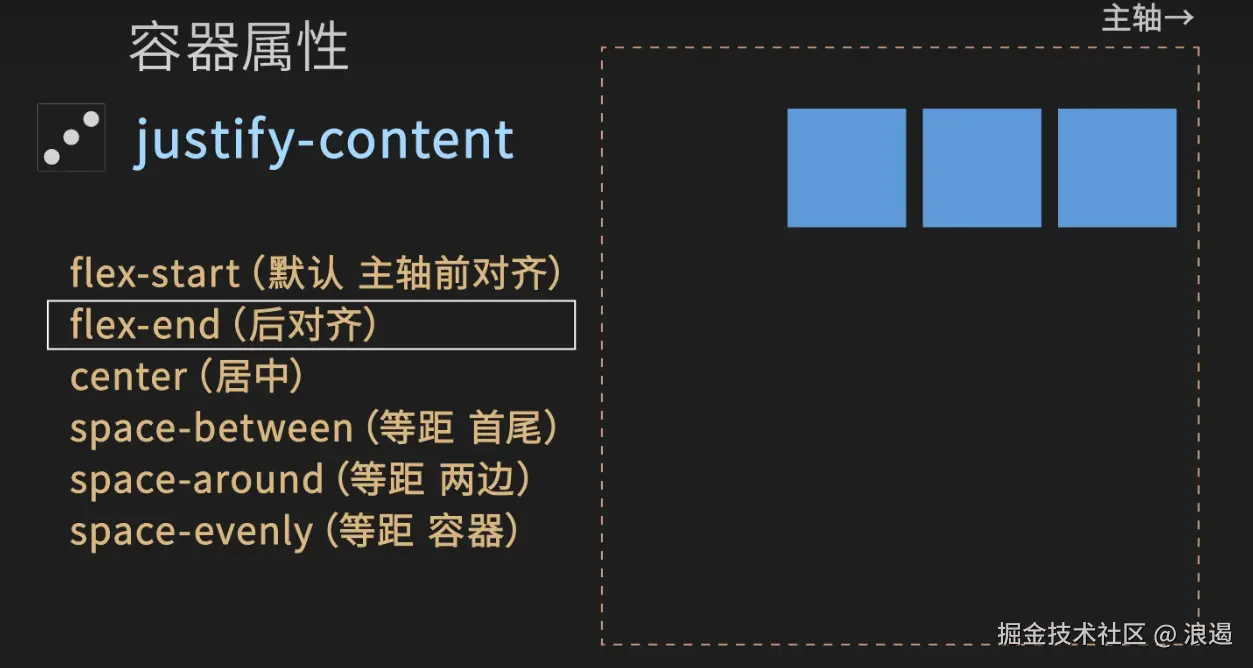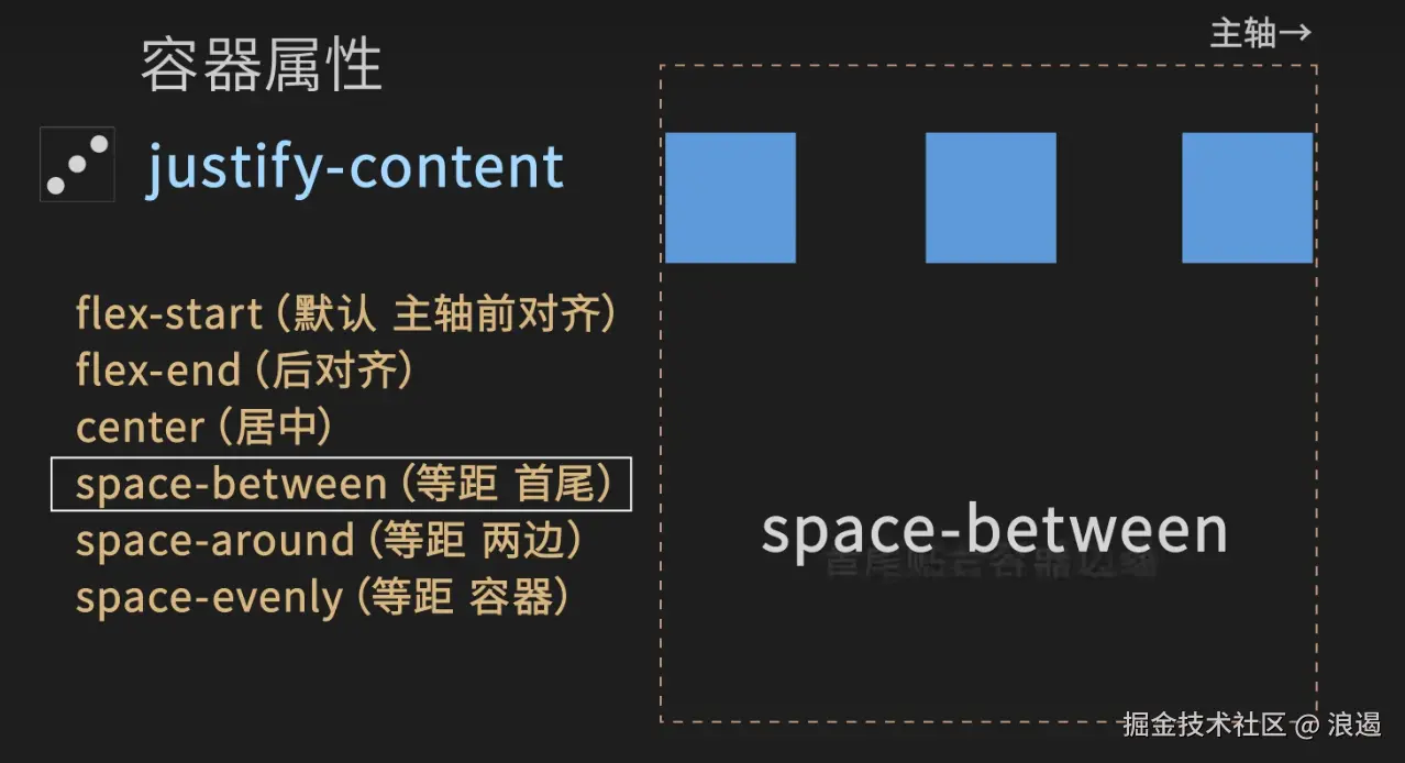 row、row-reverse、column和column-reverse。 - justify-content:定义主轴上的对齐方式,例如