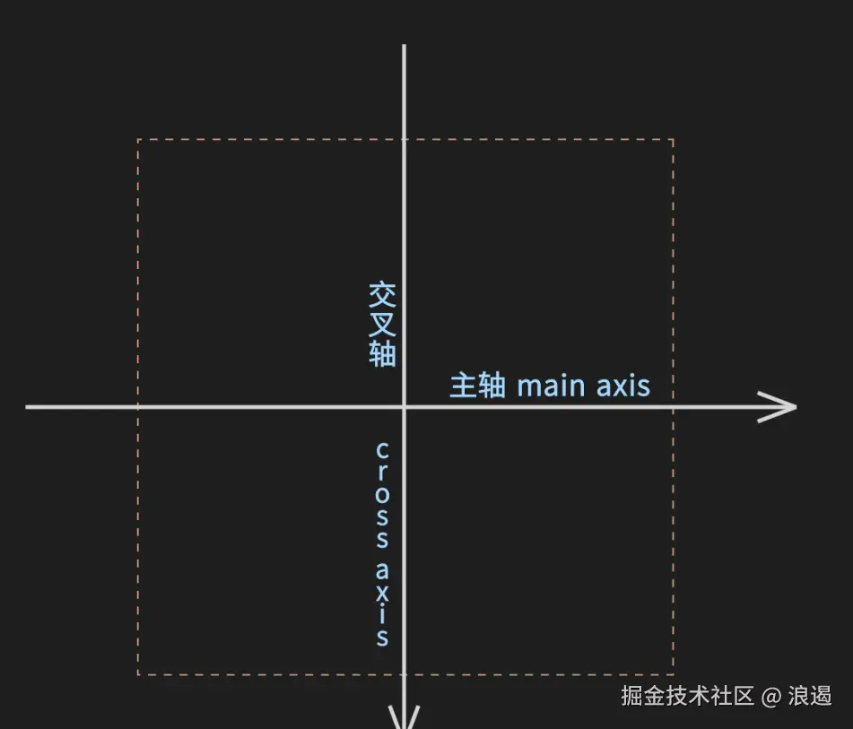 容器默认存在两条轴: 主轴(Main Axis) 和 交叉轴(Cross Axis) ,其中主轴方向为水平方向(默认为row),交叉轴为垂直方向(默认为column)