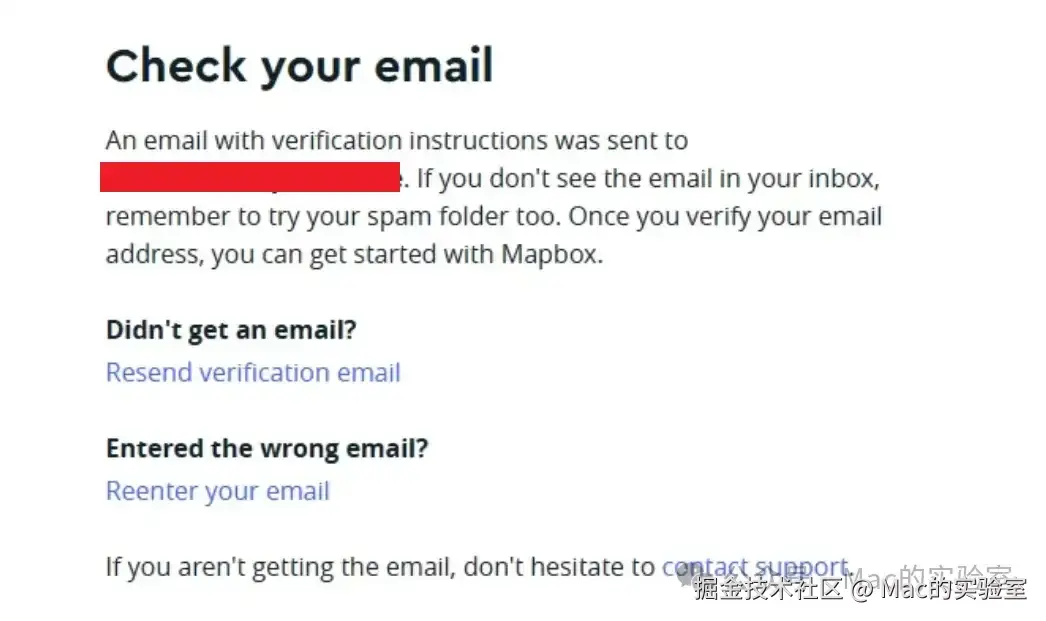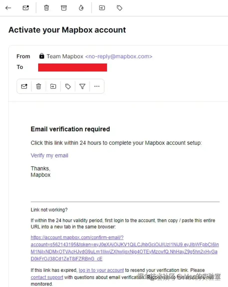 填写信用卡通过验证后,Mapbox会跳转到要求你激活邮箱验证链接的页面