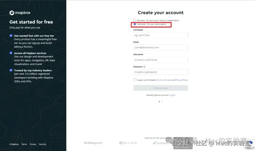 点击sign up进入mapbox的申请页面,选择个人申请