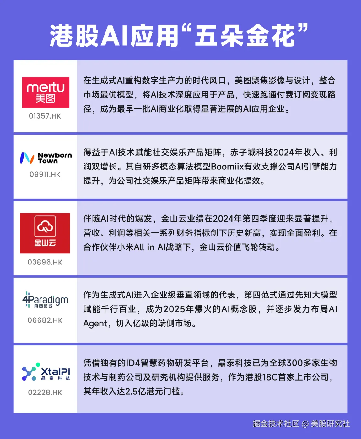 2025年初,DeepSeek大模型的横空出世再度点燃市场热情。当前,AI技术已在内容创作、金融、医疗等核心领域展现显著价值。随着2025年AI应用端爆发预期升温,美图、赤子城、金山云等港股市场一批深耕垂直赛道的AI企业正加速崭露头角,部分进入商业化兑现期。
