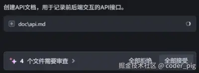 - 善用文档:描述清楚自己的需求很重要!!!AI 想很多,有时可能会超出我们的需求,做一些无用功或者负向操作,可以通过 文档 的形式 提供上下文,对其进行 约束,减少 "幻觉"。如:请你先阅读readme文档,理解我的需求,再执行XXX。另外,AI上下文有限,每次给AI的任务不要 太大太多,任务拆分得越小,实现越准确。