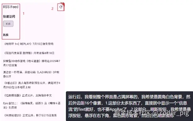 成功拿到RSS数据后,再接着让它给我们写UI。截图了iphone负一屏某个小组件,然后 画框框+数字标注,让它实现一个这样的页面效果,并按我要求进行调整: