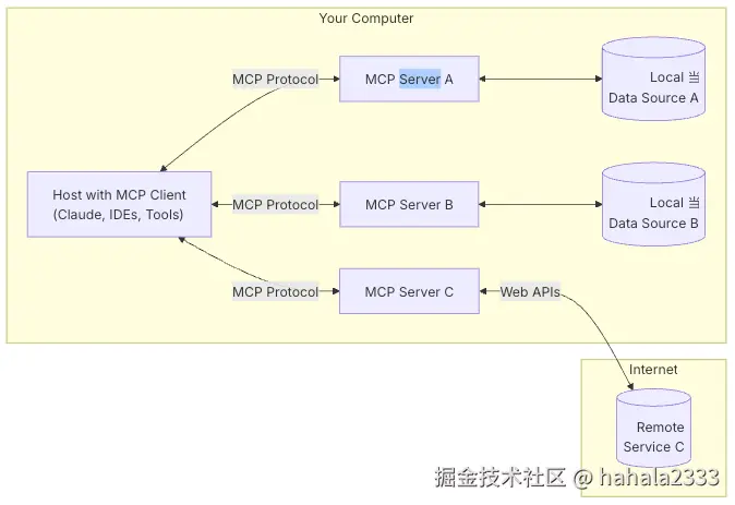 MCP 的核心遵循客户端-服务器架构,其中主机应用程序可以连接到多个服务器