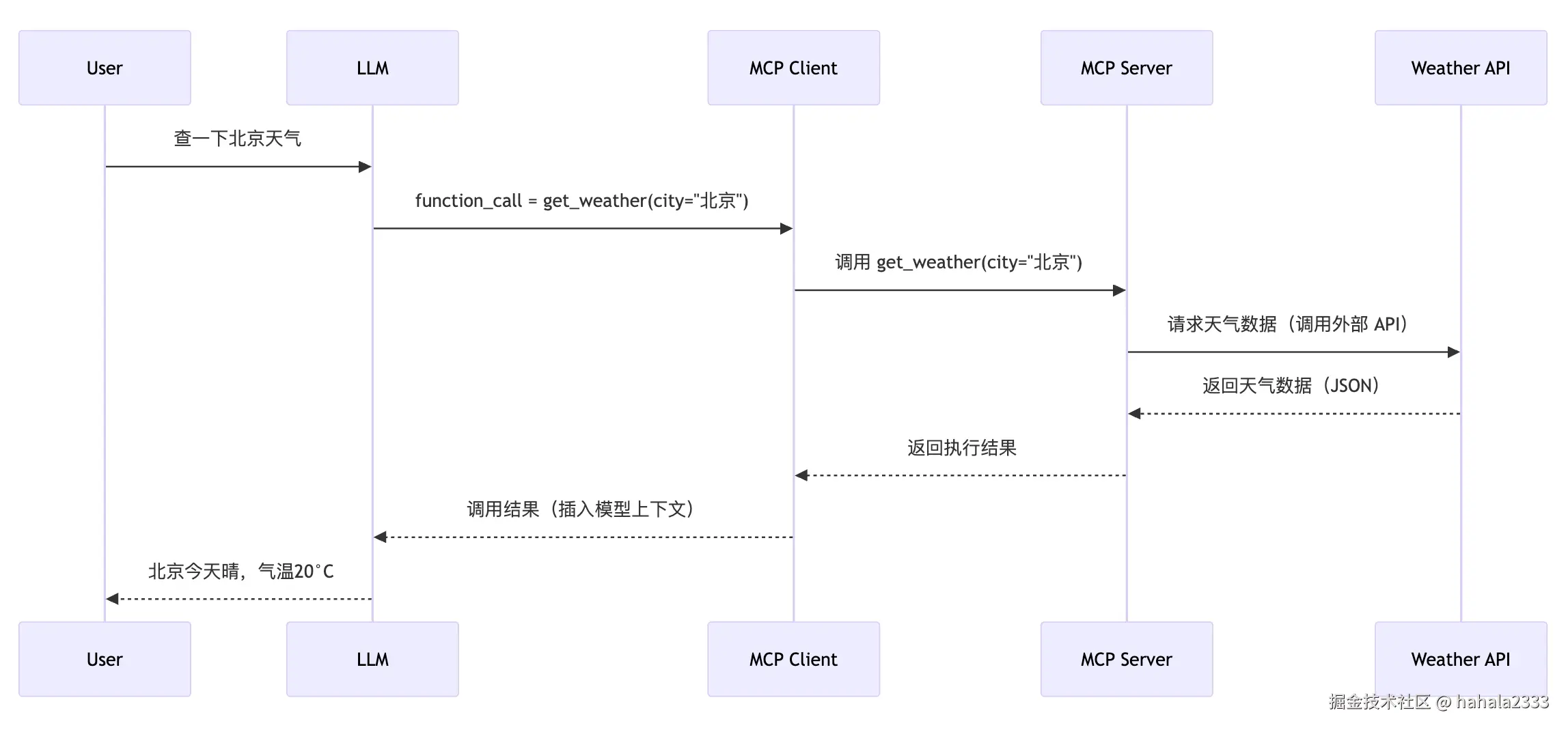 LLM->>MCP Client: function_call = get_weather(city="北京")