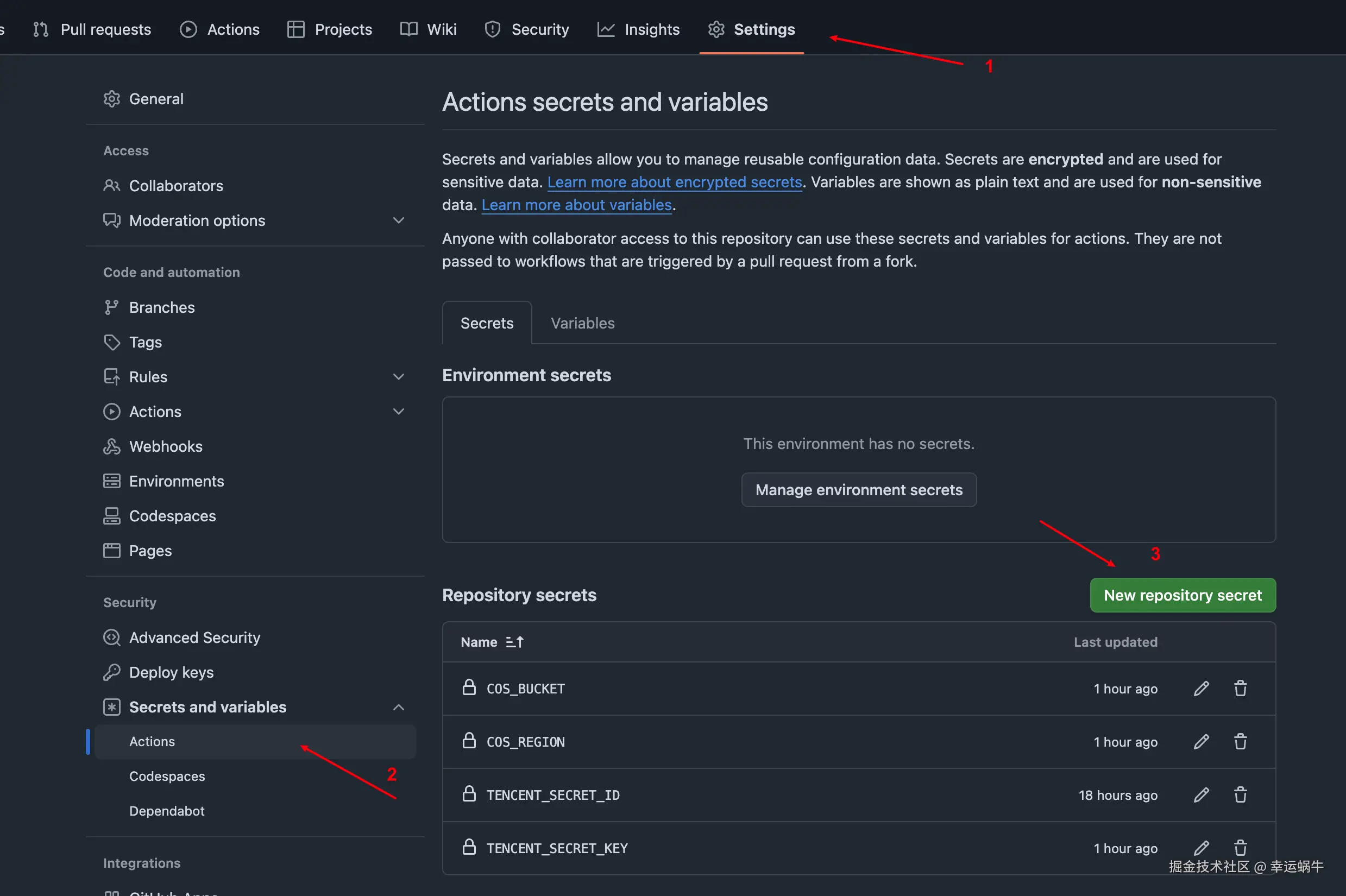 GitHub 提供了"Secrets"功能来安全地存储敏感信息(如 API 密钥),可以在工作流中使用 ${{ secrets.SECRET_NAME }} 语法引用。