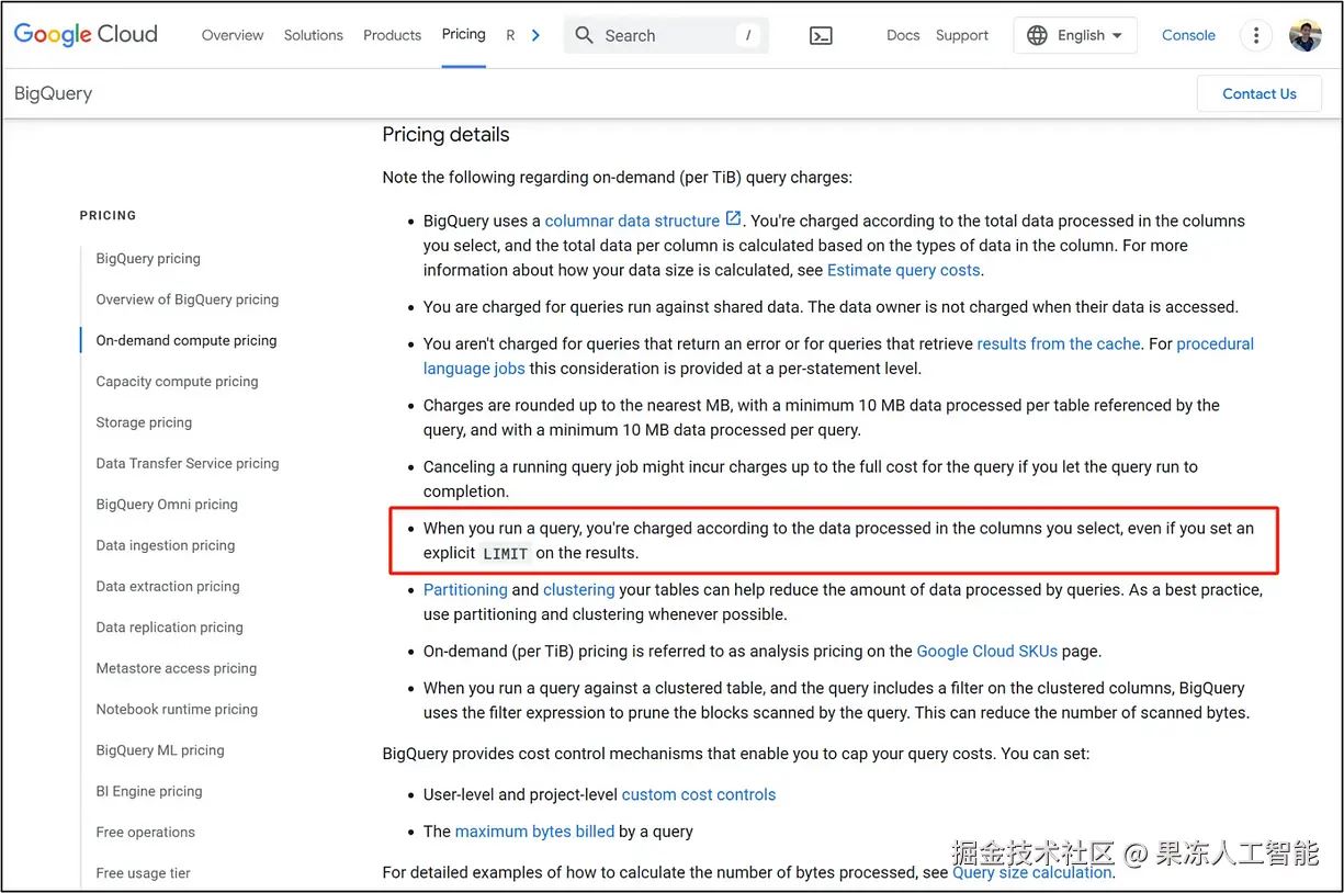 这简直违反常识——其他云厂商都是按“实际处理的数据”收费,而不是按“引用的总表大小”。但 BigQuery 的账单,是绑定到你的查询“碰到”的整个数据集上的,这让工程师在估算成本时完全抓瞎。