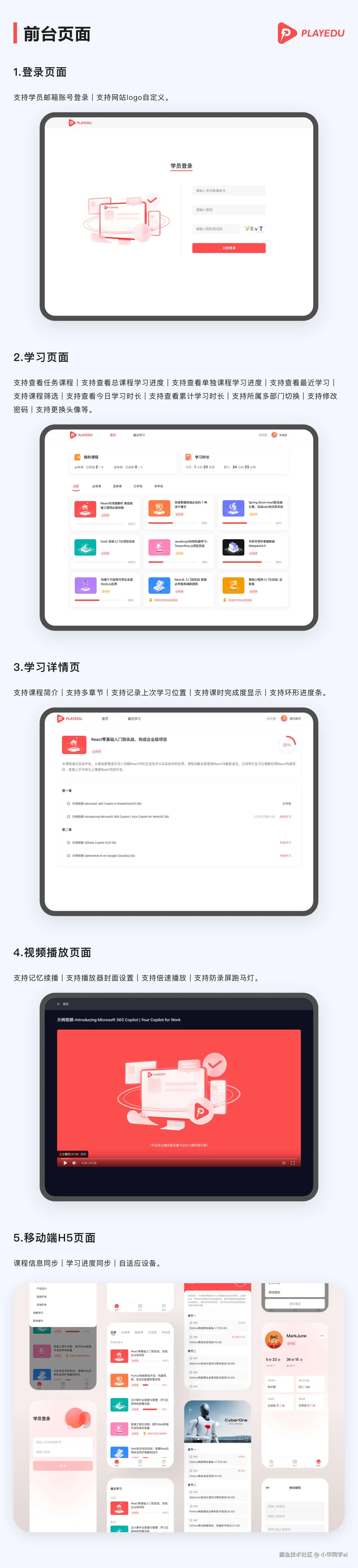- 课程体系搭建:支持视频/文档/图文混合编排,可设置章节解锁条件