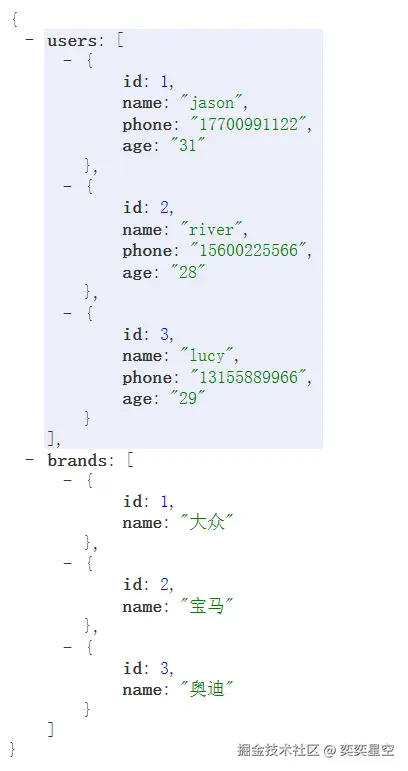 { "users": [ { "id": 1, "name": "jason", "phone": "17700991122", "age": "31" }, { "id": 2, "name": "river", "phone": "15600225566", "age": "28" }, { "id": 3, "name": "lucy", "phone": "13155889966", "age": "29" }, { "id": "4", "name": "grance", "phome": "13355669988", "age": "22" } ]}
