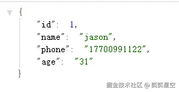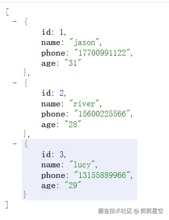 { "id": 4, "name": "Lucy", "phone": "18977882233", "age": "22"}JSON