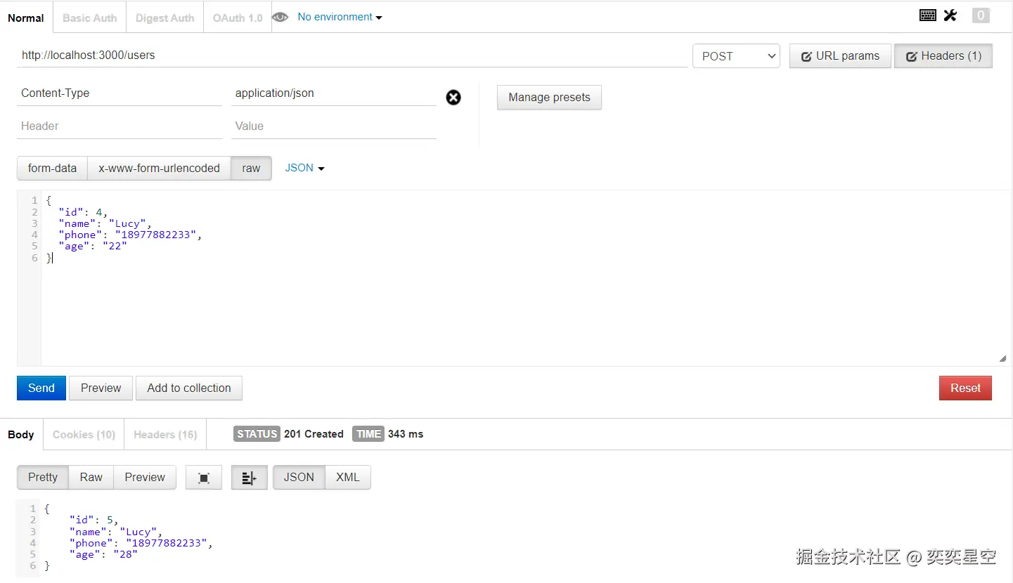 如图,发送请求添加成功,此时再访问http://localhost:3000/users,会多一条刚才新增的数据。