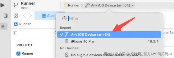 提示设备的错误,解决方案:在这里配置设备,获取UDID可以通过:苹果手机连上Mac,在XCode顶部导航栏选择Window -> Devices and Simulators打开后即可看到设备信息,其中Identifier就是设备ID。