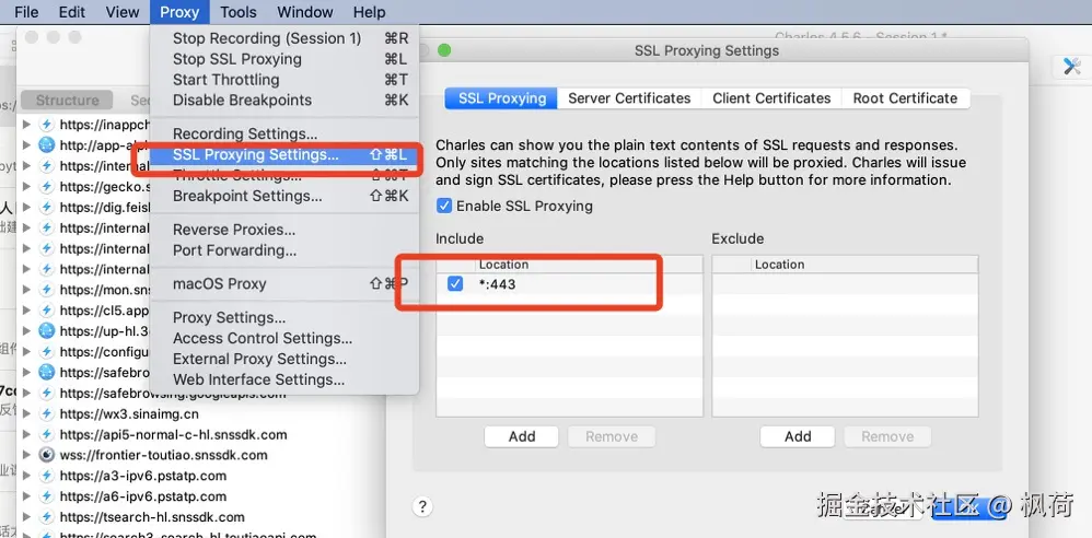 f. charles => proxy => ssl proxy settting => host: *, port: 443 -