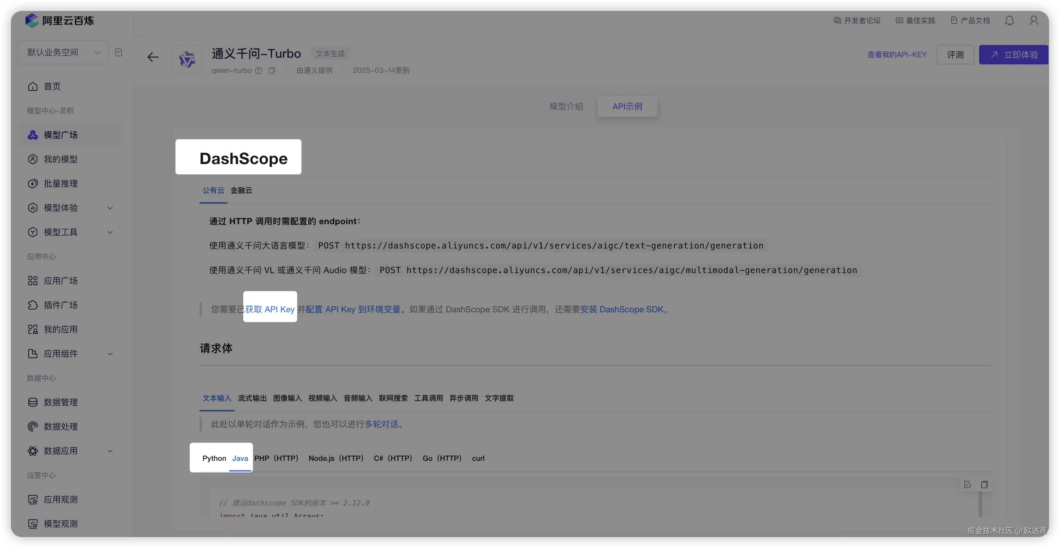 选择 DashScope,再选择 Java,提供了完整的接入示例,直接 copy 到本地执行;