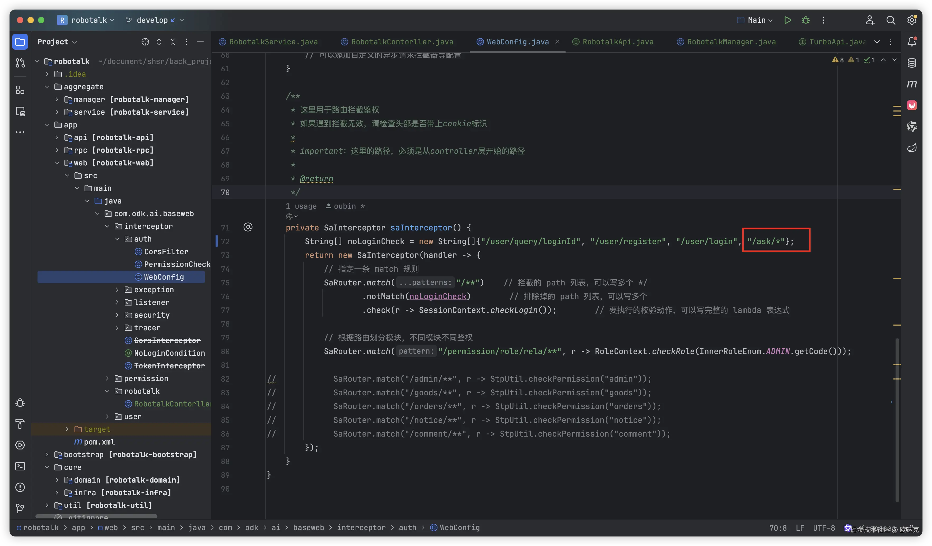 这里需要注意的是按照默认配置,所有接口都是需要登录认证的,但是我们目前并不需要做登录认证,所以需要在拦截器中过滤请求。