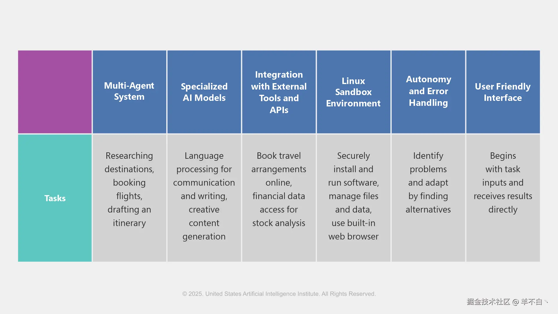 在AI任务执行领域,Manus通过智能体工作流引擎重新定义了自动化边界。其核心创新不在于单一模型的认知突破,而是构建了多智能体协同系统与工具链网络的深度融合架构,这种设计使其在复杂任务处理中展现出独特的工程价值。