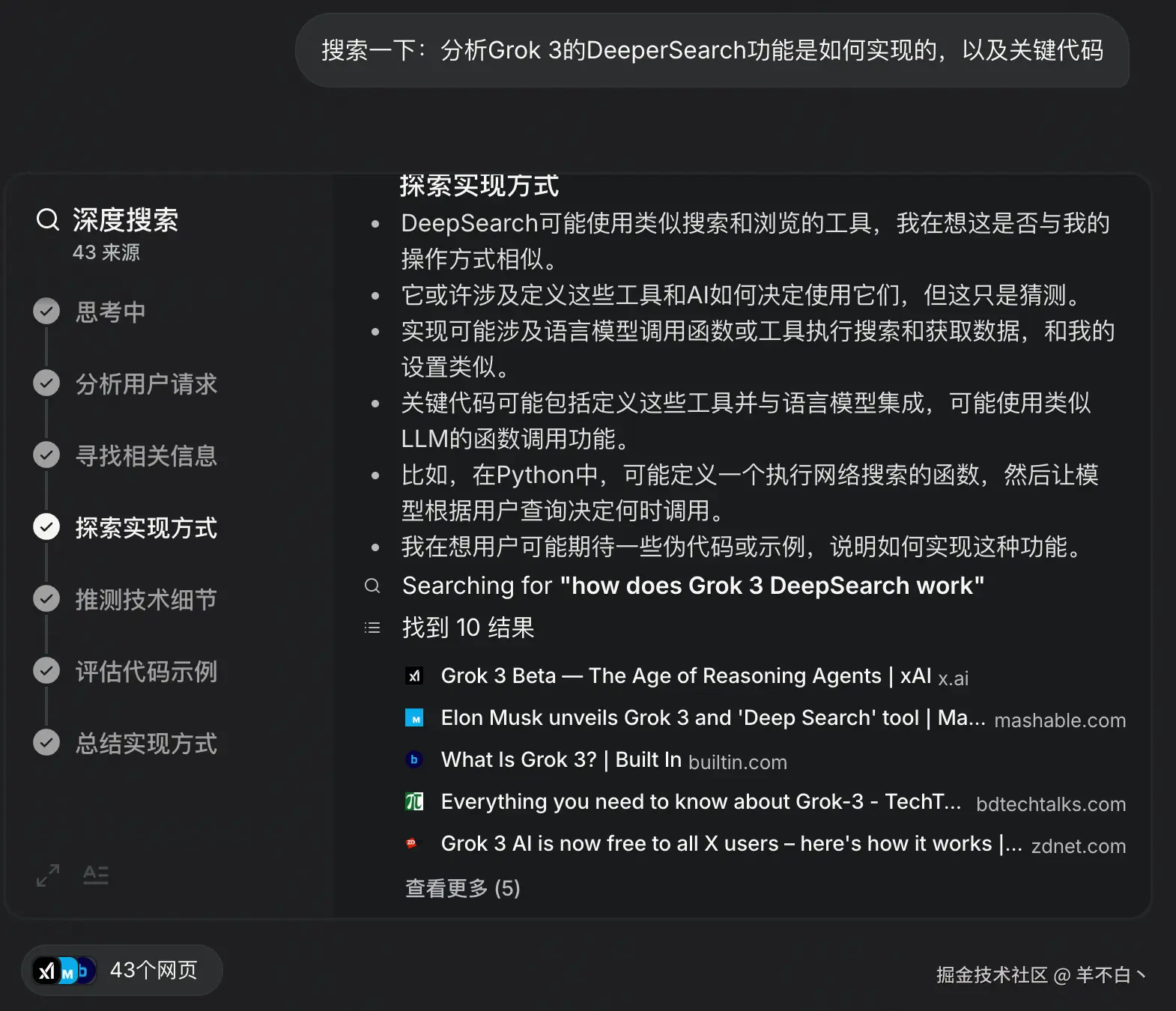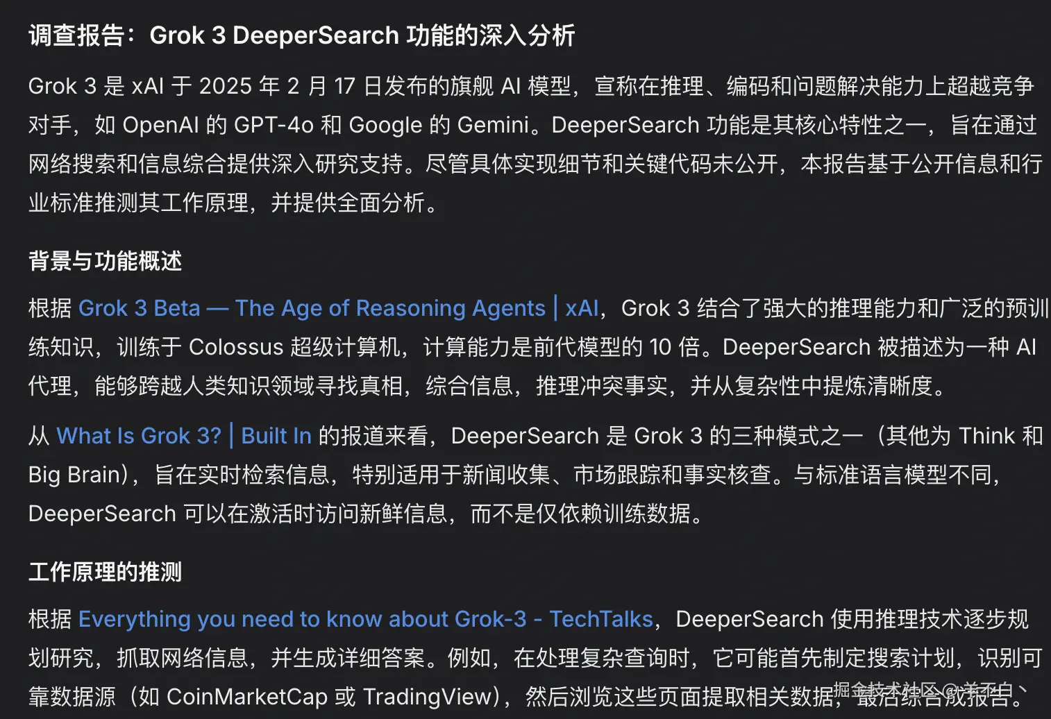 作为大模型领域首个将"深度思考时间"作为核心卖点的产品,Grok3的DeeperSearch功能展现出一套独特的认知增强体系。该功能通过分阶式思考架构与动态知识融合算法,实现了从表层搜索到认知建构的范式跃迁。