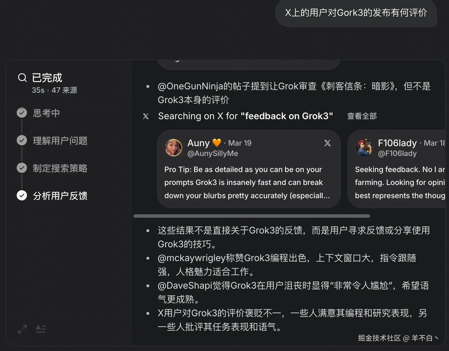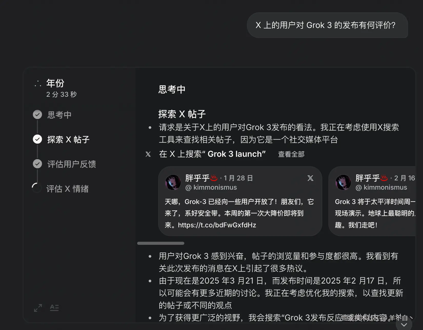 使用示例问题进行提问,发现规划不一样了,并可以搜索X平台帖子