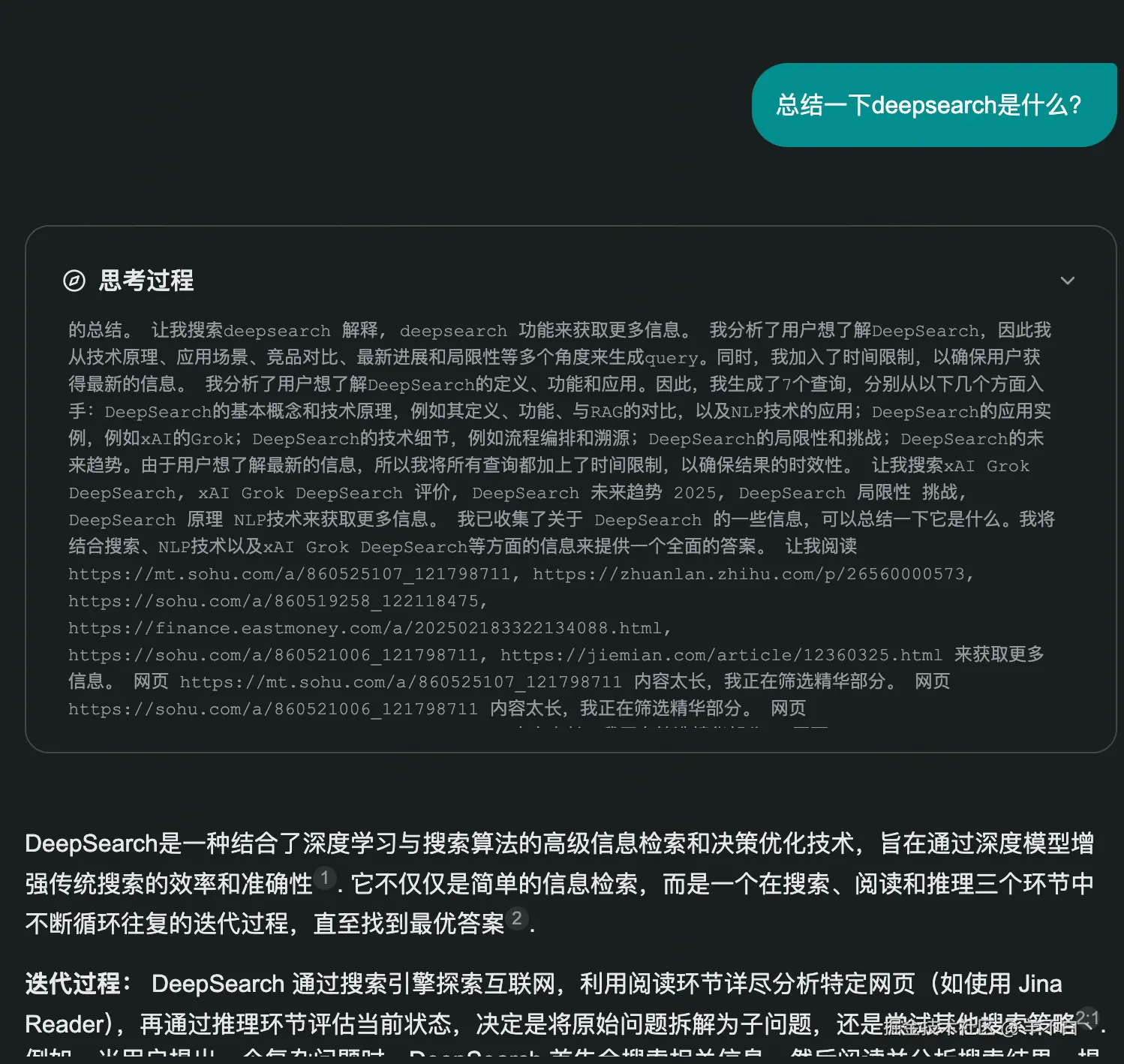产品设置的DeepSearch与DeeperSearch双通道,本质是算力资源分配的梯度策略。基础模式采用轻量级思维链(CoT)完成即时响应,而增强模式则启动全量认知架构:通过扩展上下文窗口至百万token级容量,允许系统在更广阔的知识空间进行关联挖掘。实测显示,增强模式会执行多轮信息筛选-重构循环,每次迭代都会基于前序发现调整搜索策略,形成螺旋上升的认知轨迹。
