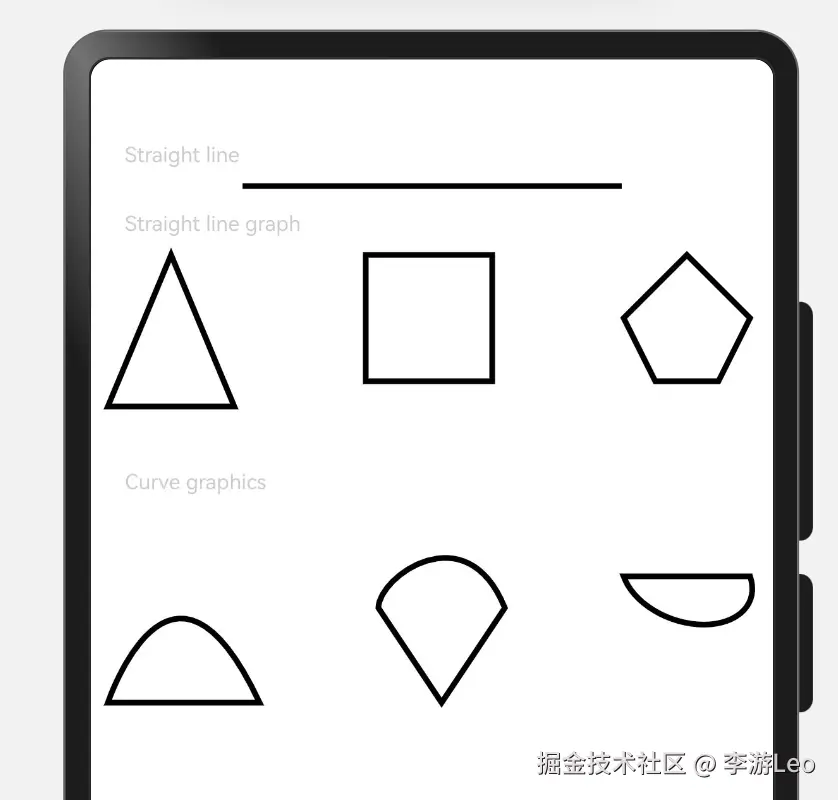 commands('M0 0 L600 0')绘制了一条长度为 600px 的水平直线,设置边框颜色为黑色,宽度为 3vp。 - 直线图形绘制:使用不同的