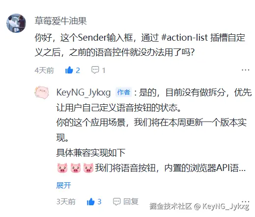 在上版本中,当开发者使用 Sender 输入框组件 的自定义 #action-list 插槽时,往往需要牺牲内置的 语音识别功能 和 内置的发送、清除按钮功能。