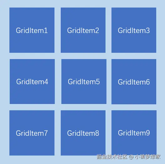 Grid组件为网格容器,是一种网格列表,由“行”和“列”分割的单元格所组成,通过指定“项目”所在的单元格做出各种各样的布局。Grid组件一般和子组件GridItem一起使用,Grid列表中的每一个条目对应一个GridItem组件。