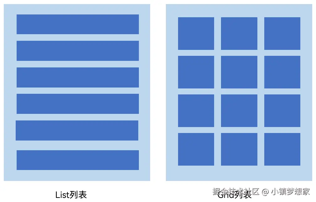 常见的列表有线性列表(List列表)和网格布局(Grid列表):