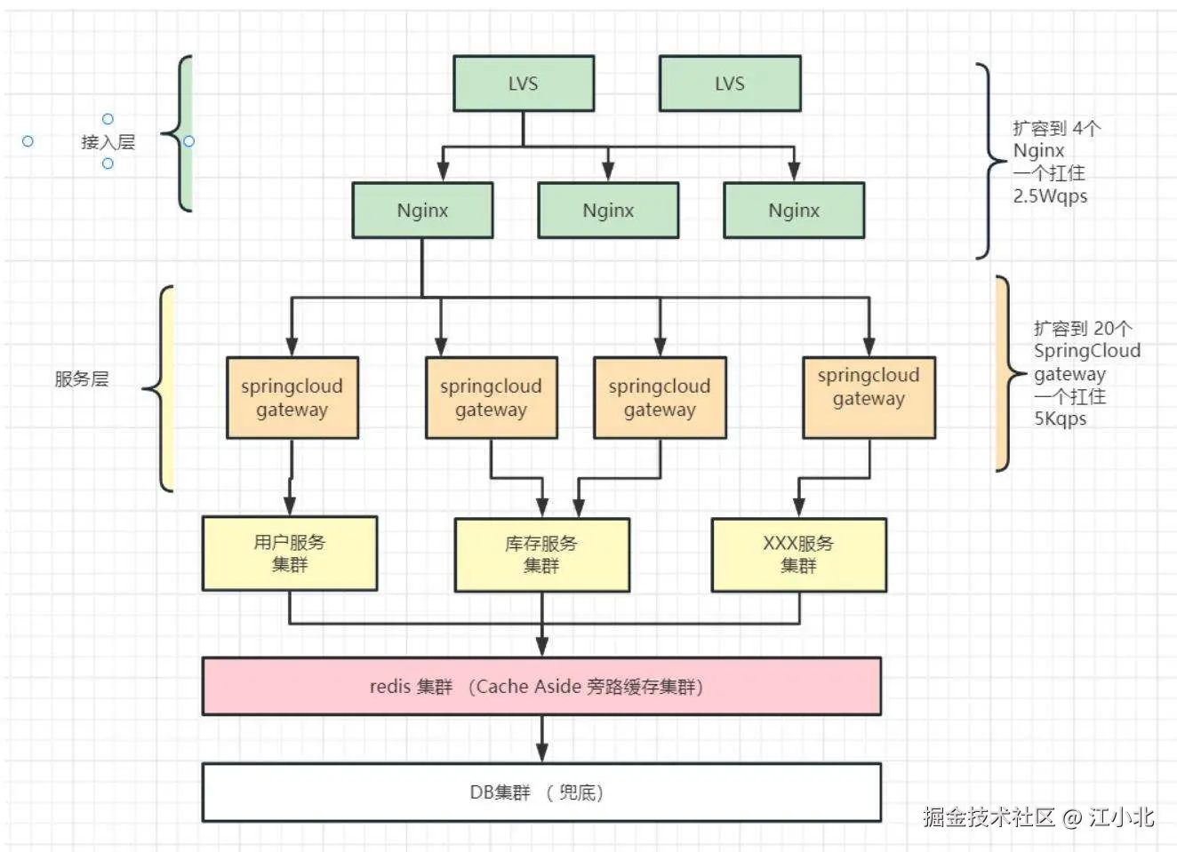 通过扩容和限流的结合,我们的系统应该能够承受10W QPS的流量,因为可以将流量限制在1W QPS,甚至是1K QPS。