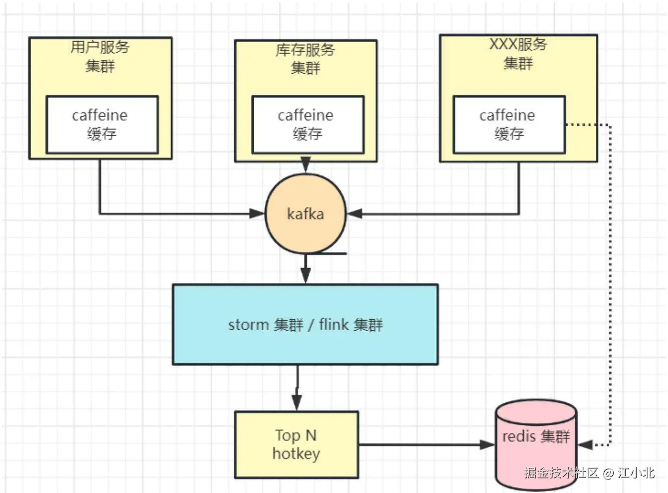 - Hermes 服务端集群:接收 Hermes-SDK 上报的缓存访问数据,进行热点探测,将热点 Key 推送给 Hermes-SDK 进行本地缓存。
