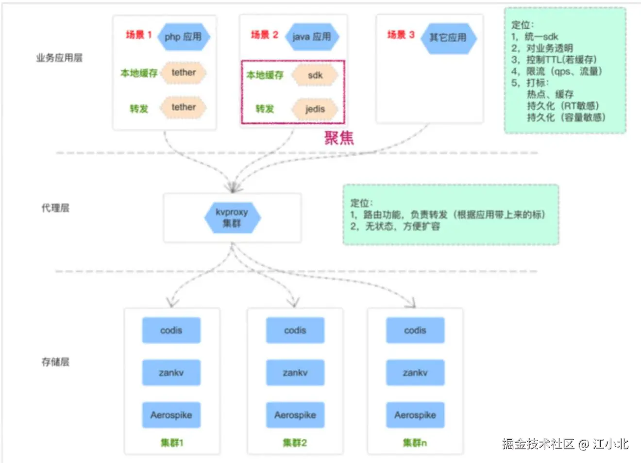 - 缓存集群:由代理层和存储层组成,为应用客户端提供统一的分布式缓存服务入口。