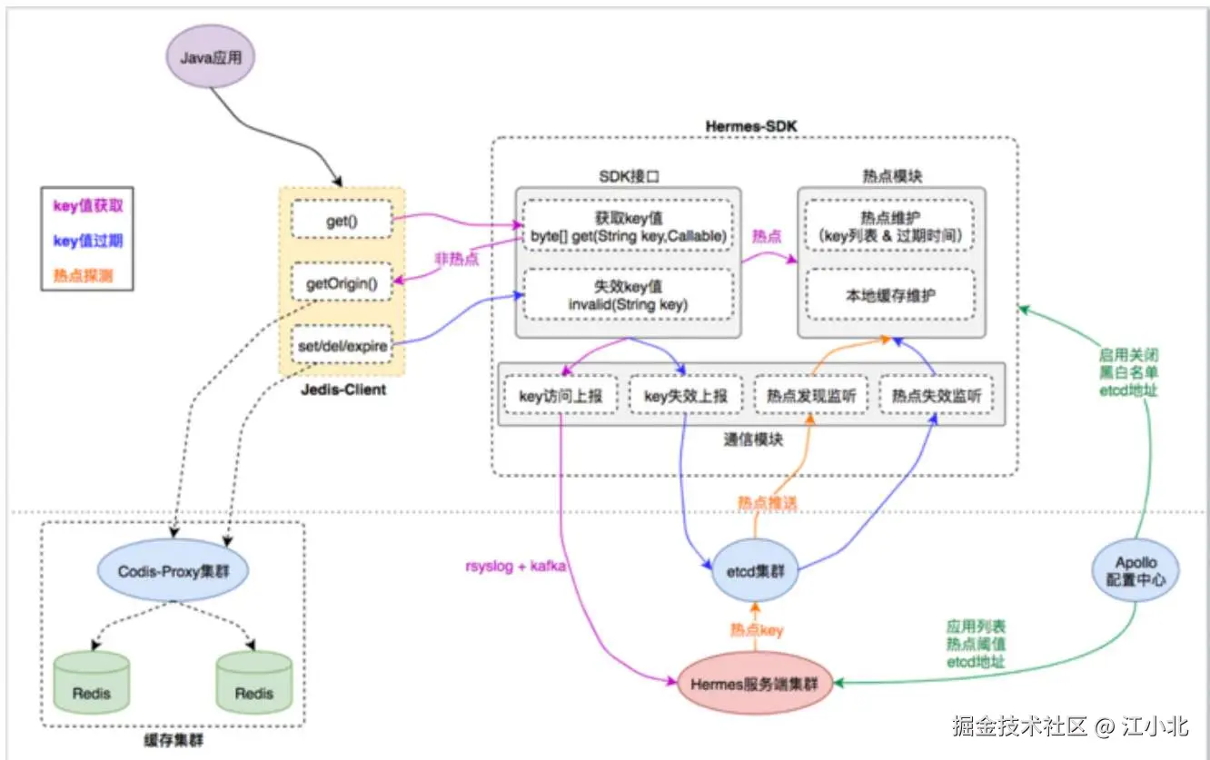- Hermes-SDK:自研的“热点发现 + 本地缓存”功能的 SDK 封装,Jedis-Client 通过与 Hermes-SDK 交互来集成这些能力。