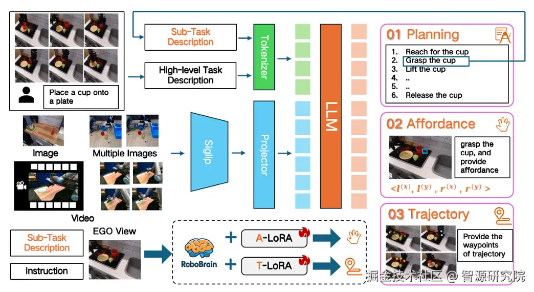 RoboBrain由三个模块组成:用于任务规划的基座模型、用于可操作区域感知的A-LoRA模块和用于轨迹预测的T-LoRA模块。在推理时,模型首先感知视觉输入,并将输入指令分解为一系列可执行的子任务,然后执行可操作区域感知和轨迹预测。RoboBrain采用多阶段训练策略,使其具备长历史帧记忆和高分辨率图像感知能力,进而提升场景感知和操作规划的能力。